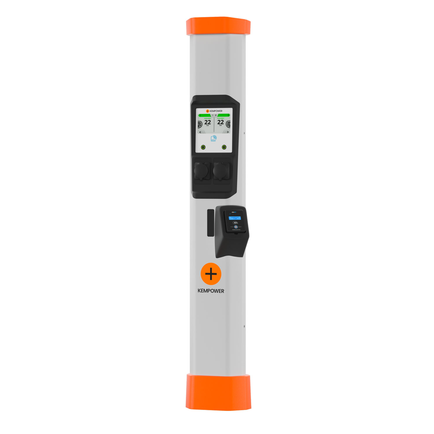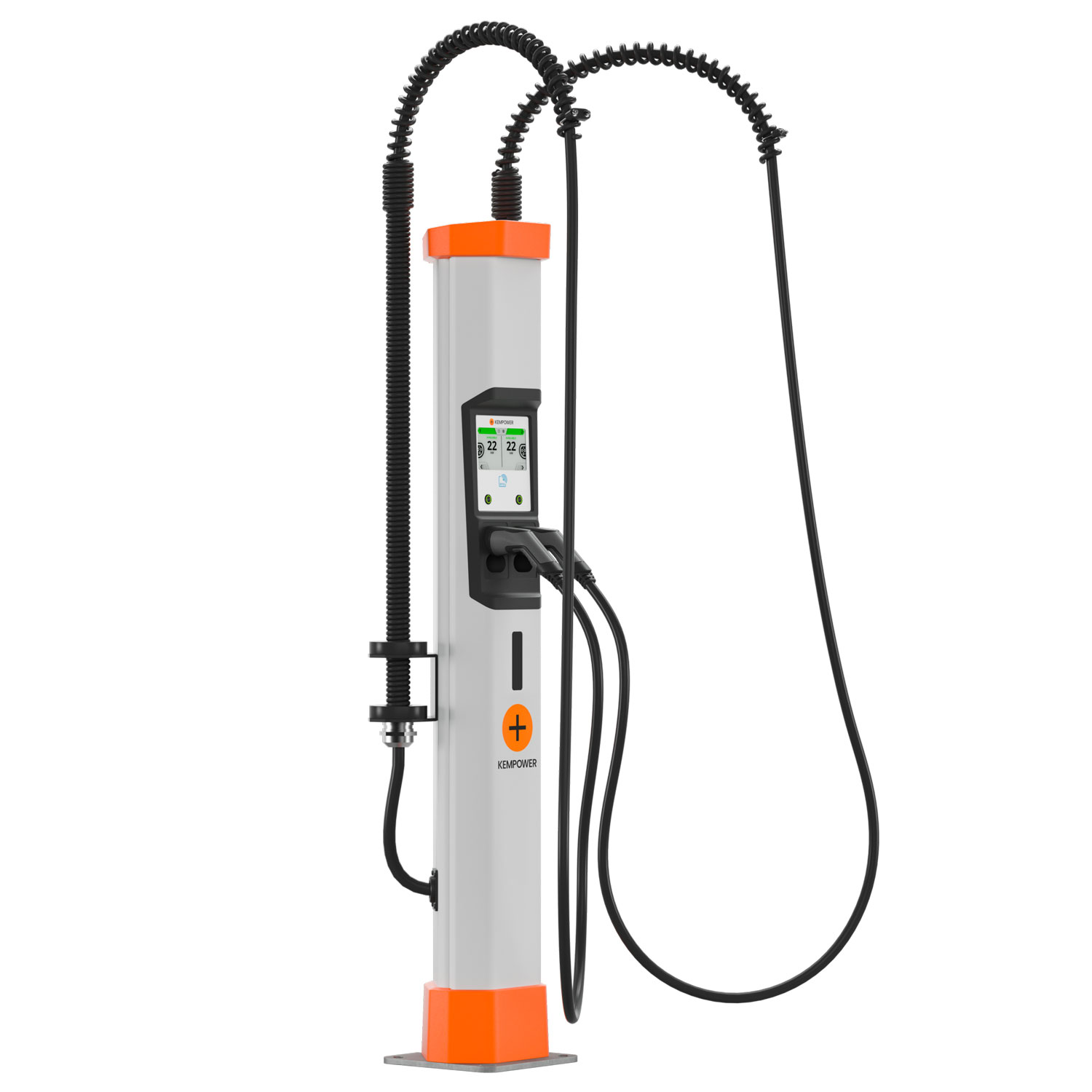 Kempower AC Satellite is always supplied with a double charging point structure, requiring two separate 3 x 32 A AC supply cables with RCD upstream on the low voltage panel. To maximize the potential, we recommend using Kempower AC Satellites in indexed parking lots.